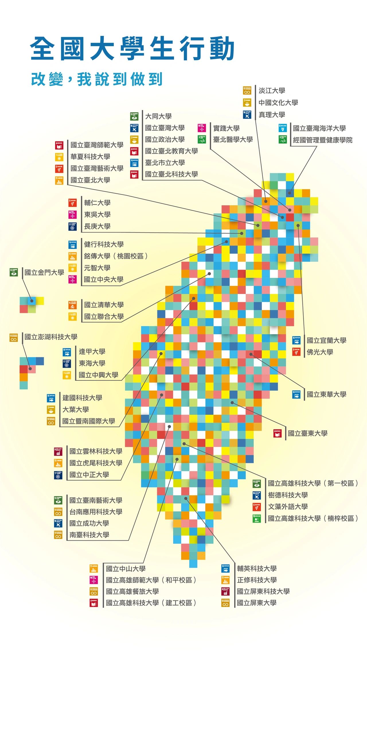 池田 SGI 會長在 2019《和平倡言》中提出建議:「推進世界各大學成為達成 SDGs中心的潮流」,因此,為實踐SDGs目標,台灣創價學會大學生與研究生發揮創造力、行動力,於各大專院校展現對 SDGs 目標的行動!